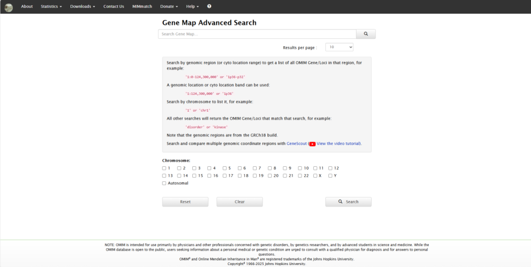 https://omim.org/search/advanced/geneMap,进入OMIM geneMap页面。