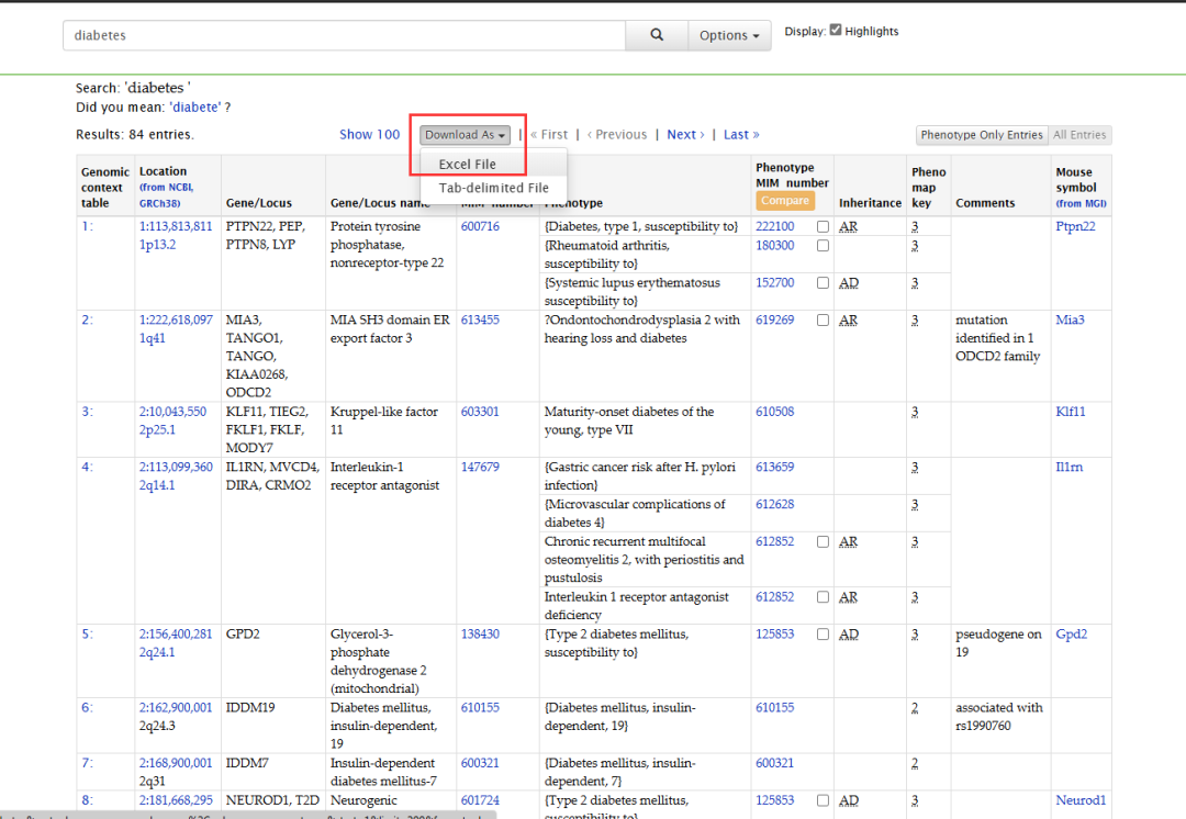 ③ 获取靶点信息:搜索结果页面会列出与疾病相关的靶点基因。点击“Download As”项目下的“Excel File”,即可下载全部信息。