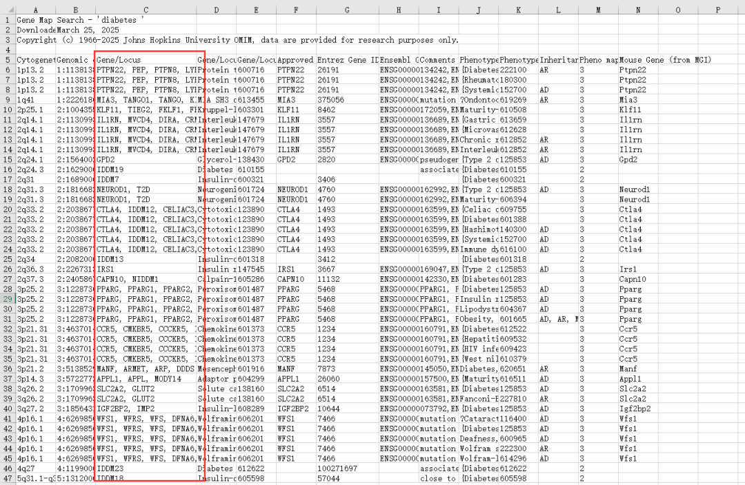 ④ 数据整理: 打开下载的CSV文件,筛选“Relevance score”列,保留评分≥1.0的靶点(根据需求可调整阈值)。此时,“Gene Symbol”列即为糖尿病靶点基因名称.