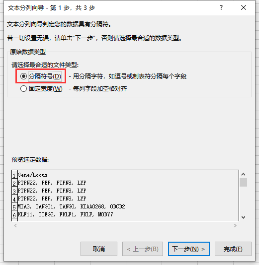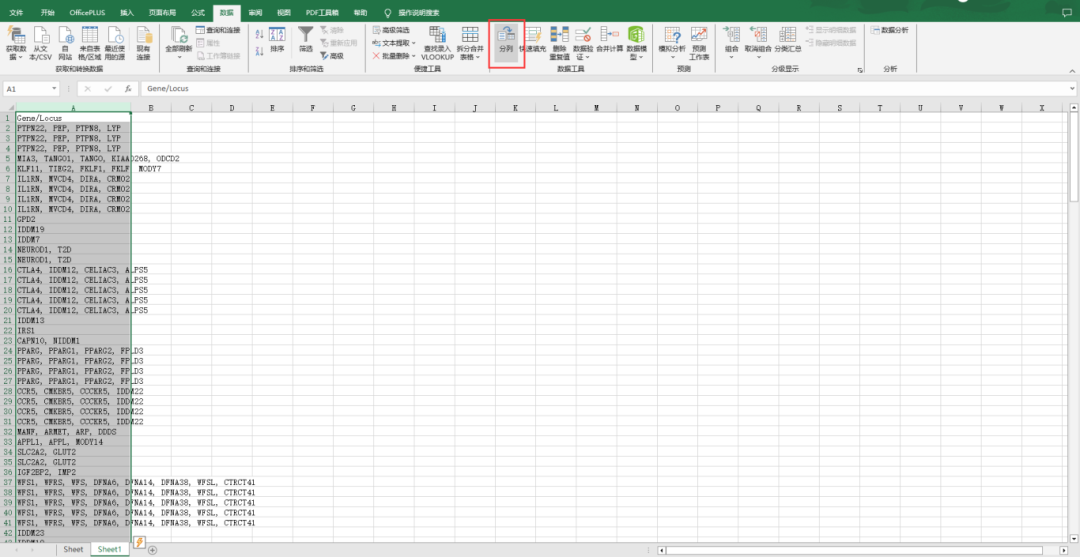 选中“Gene/Locus”列的所有数据,点击Excel的【数据】选项卡,选择【分列】功能。