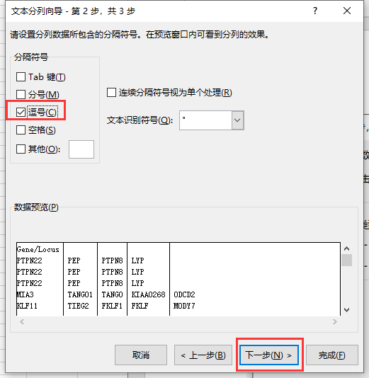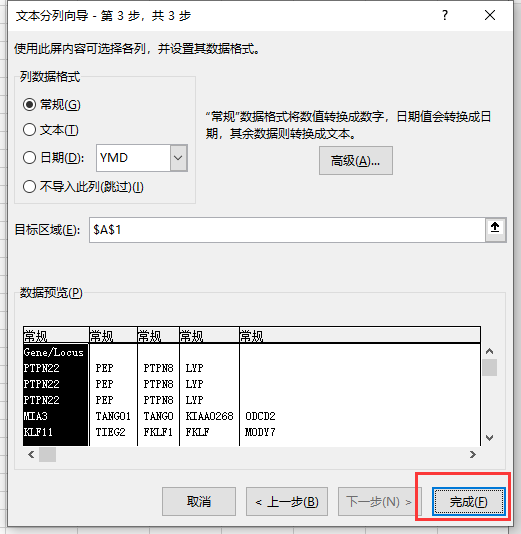 然后依次选择【分隔符号】→【逗号】→【常规】→【完成】,可以看到数据变成如下格式: