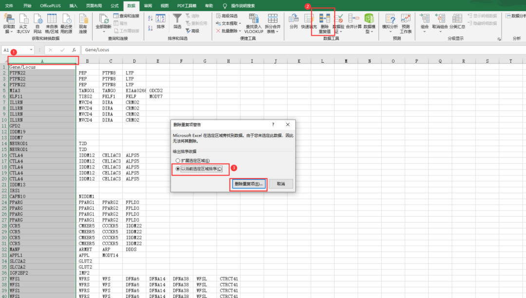 最后,将所有列的数据全部合并到一列,并再次【删除重复值】去重,这样,您就可以得到从OMIM数据库获取的糖尿病靶点表格文件了。