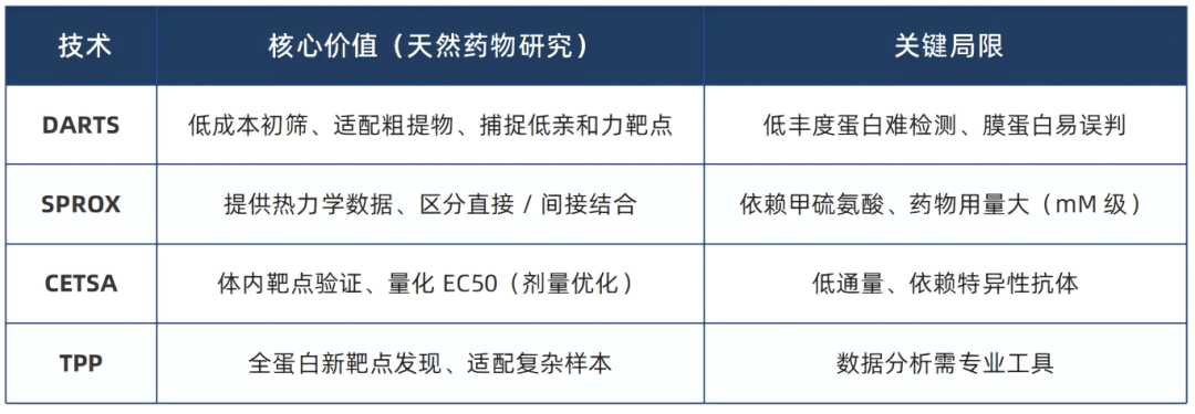 这些无标记技术的发展为天然药物靶点筛选提供了“不破坏天然产物活性、贴近生理场景、适配多靶点特性” 的解决方案。其中,DARTS 与 SPROX 在初筛与机制解析中不可或缺,CETSA 是体内验证的关键,而 TPP 则凭借高通量、无预设靶点的优势,成为天然药物 “新靶点发现与复杂机制解析”的核心推动力。