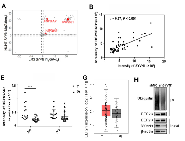 为了揭示SYVN1影响HCC转移的机制,作者使用质谱技术鉴定了在LM3和HUH7细胞系中与SYVN1相互作用的分子。结果表明,HSP90家族成员和SYVN1之间存在相互作用(图8A、B)。在全细胞蛋白质组学数据中,有血管侵袭的HCC中HSP90家族蛋白及其共伴侣在肿瘤组织中的表达显著高于相应的瘤周组织(图8E)。另外来自GEPIA数据库的转录组数据表明,与正常组织相比,EEF2K在肿瘤组织中的表达增加(图8G)。IP和Western blotting实验也显示在肝癌细胞中SYVN1增加了EEF2K泛素化水平(图7H)。