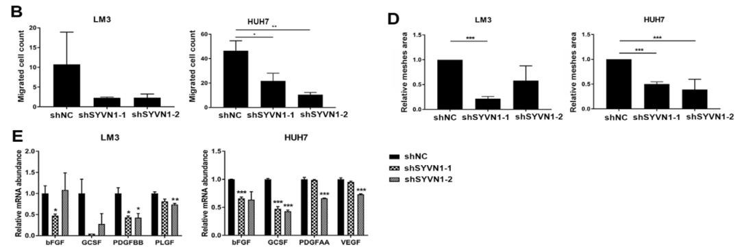 敲低了SYVN1后的肝癌细胞的迁移能力和侵袭能力都有下降(图7B、D),并且与血管生成相关分子的mRNA表达水平也下降了(图7E)。说明SYVN1在癌细胞迁移和血管生成过程中起到了作用。