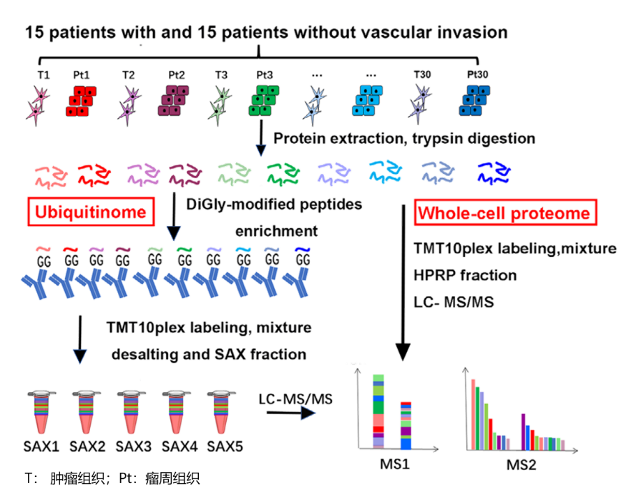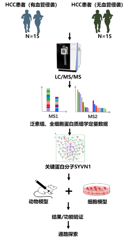 本研究的目的在于探讨HCC血管侵袭的分子机制,首先通过临床样本的蛋白组学检测寻找到关键的蛋白和分子通路,样本来自于浙江大学第一附属医院从2017年10月至2018年7月间收集的接受手术切除的肝癌患者。最终用于组学检测的样本共30例,其中15例为无血管侵袭的HCC患者组织样本,另15例来源于有血管侵犯的HCC患者。通过泛素组分析发现两组样本中蛋白质泛素化修饰的水平和模式有明显差别,结合全细胞蛋白质组的差异蛋白分析,预测了E3连接酶SYVN1分子在HCC的发生和血管生成中起重要作用。然后通过动物和细胞模型进行验证和分子机制探索。