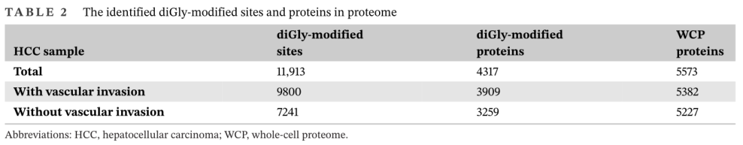 通过TMT定量蛋白质组学技术, 结合基于泛素化基序抗体的富集技术,分析了两组样本中全蛋白表达水平和泛素化蛋白水平,研究团队成功地从HCC中鉴定了总共11913个diGly(Lys-ε-Gly-Gly)修饰位点和4317个diGly-修饰蛋白(TABLE2)。
