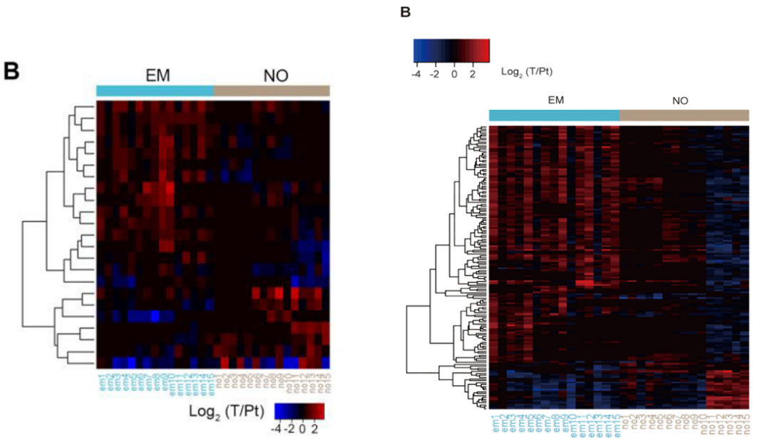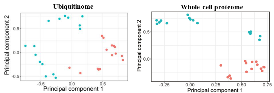 主成分分析和聚类分析显示,有血管侵袭和无血管侵袭的HCC组织样本中蛋白质表达水平和泛素化水平都存在明显差异(图3)。