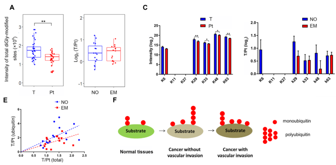 通过分析泛素化修饰蛋白组发现,肿瘤组织的泛素化修饰位点数与瘤周组织相比显著上调,并且这种现象在有血管侵袭的HCC中更明显(图4A)。位于泛素本身上的泛素修饰位点数能够体现泛素链的长度,在无血管侵袭肝癌组织样本中上调更加明显(图4C)。因此推测发生血管侵袭和转移后,泛素化的位点增多了,但泛素链的长度反而缩短了(图4F)。